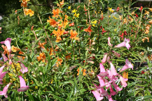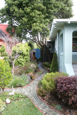 The hardest part of the garden makeover was dealing with the challenging slope in the front yard. The old stone retaining wall was crumbling and invasive ivy was smothering the whole area, including a beautiful old oak tree. The design uses the oak as inspiration, and is made the centerpiece of the entryway. New terraces were built using large moss rocks, and informal planting spaces created and filled with native understory plants. The rest of the garden is on a flat knoll on top of the hill. Concrete in the entry was removed and replaced with deep cobblestones set in a permeable pathway. On the side yard the path continues, snaking along with occasional stones replaced by a painted tile. The backyard has a patio of dry set stones with baby tears growing between the crevices. Mature trees circle the patio and include a yucca, lemon, pear, and apple. Art objects are peppered throughout.